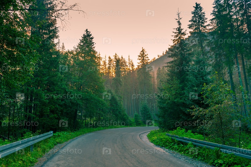 Асфальтированная дорога в горах на рассвете, путь к озеру Морские Око, Польша