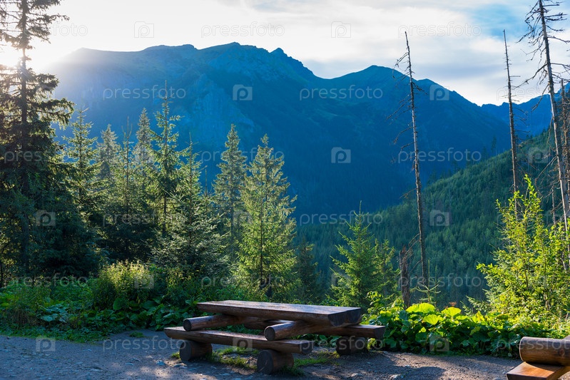 Стол и скамейка для пикника и пикник в горах на рассвете