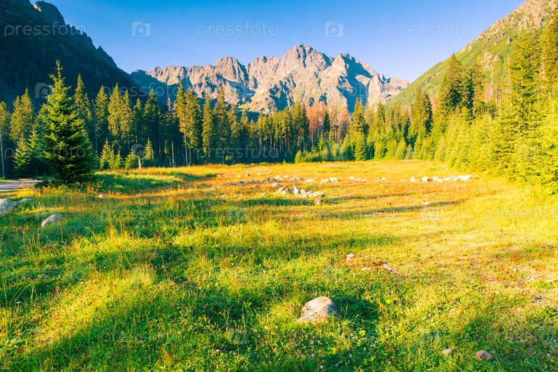 Прекрасный ландшафт поляны и высокие Татринские горы в Польше, стреляющие на рассвете