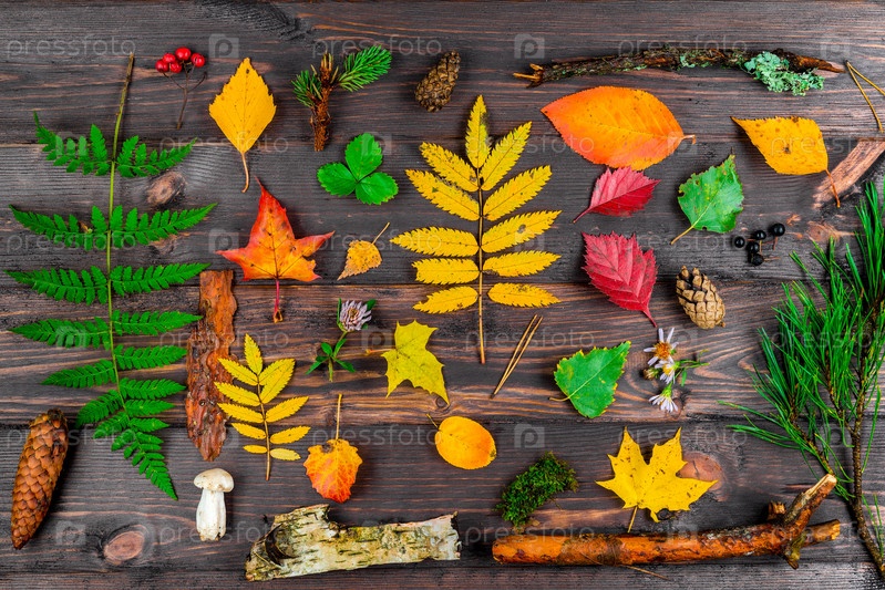 Разнообразная лесная флора на деревянных досках - осенние объекты top view set