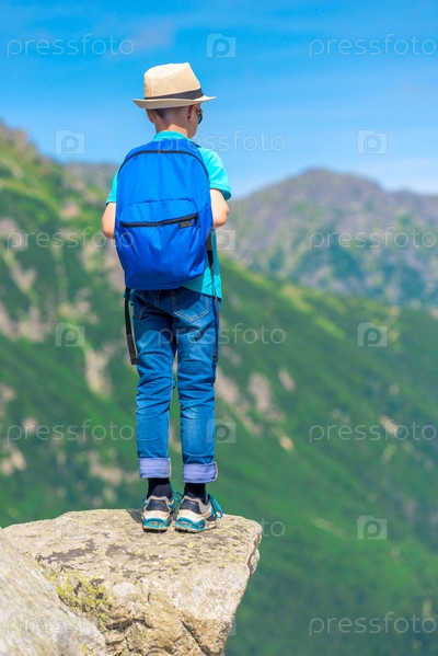 Мальчик с рюкзаком в горах стоит на скале и смотрит на горы