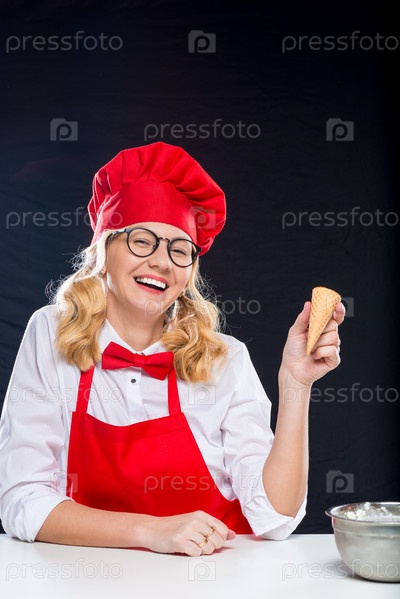 Веселый повар с мороженым в красном костюме на черном фоне