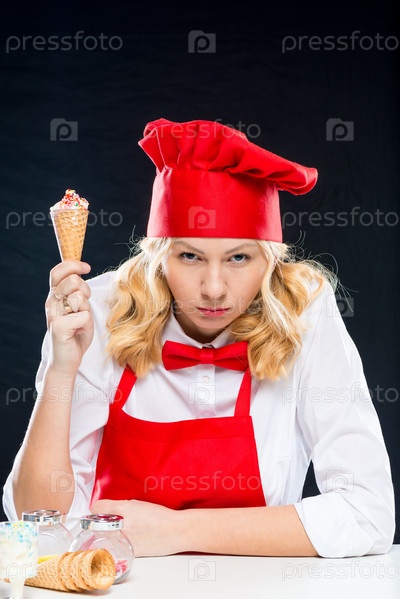 Агрессивный повар с мороженым в руке, эмоциональный портрет на черном фоне