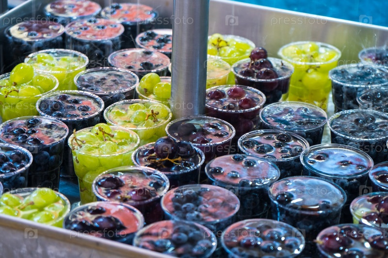 Виноград в пластиковых бокалах с водой для продажи на рынке, Венеция, Италия