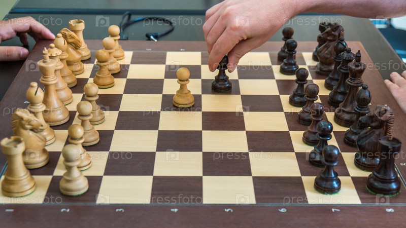 Рука, движущая деревянную шахматную фигуру на шахматной доске