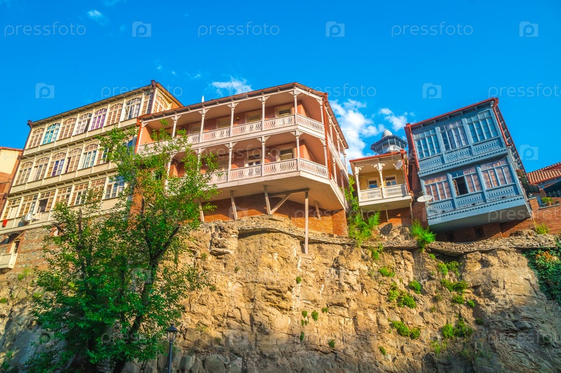 Красочные традиционные дома с деревянными резными балконами в районе Абанотубани старого города Тбилиси, Грузия