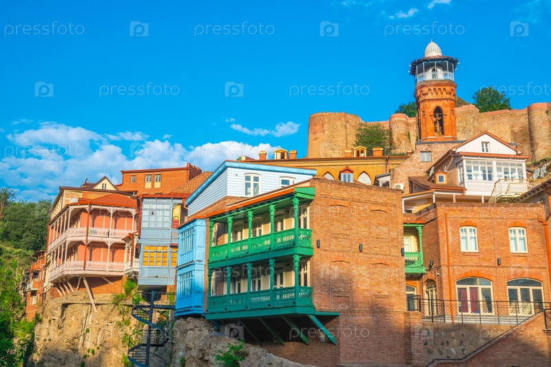 Красочные традиционные дома с деревянными резными балконами в районе Абанотубани старого города Тбилиси, Грузия
