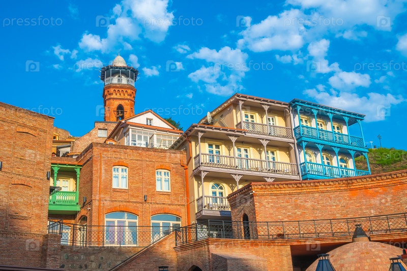 Красочные традиционные дома с деревянными резными балконами в районе Абанотубани старого города Тбилиси, Грузия