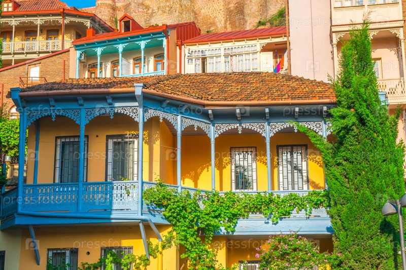 Красочные традиционные дома с деревянными резными балконами в районе Абанотубани старого города Тбилиси, Грузия