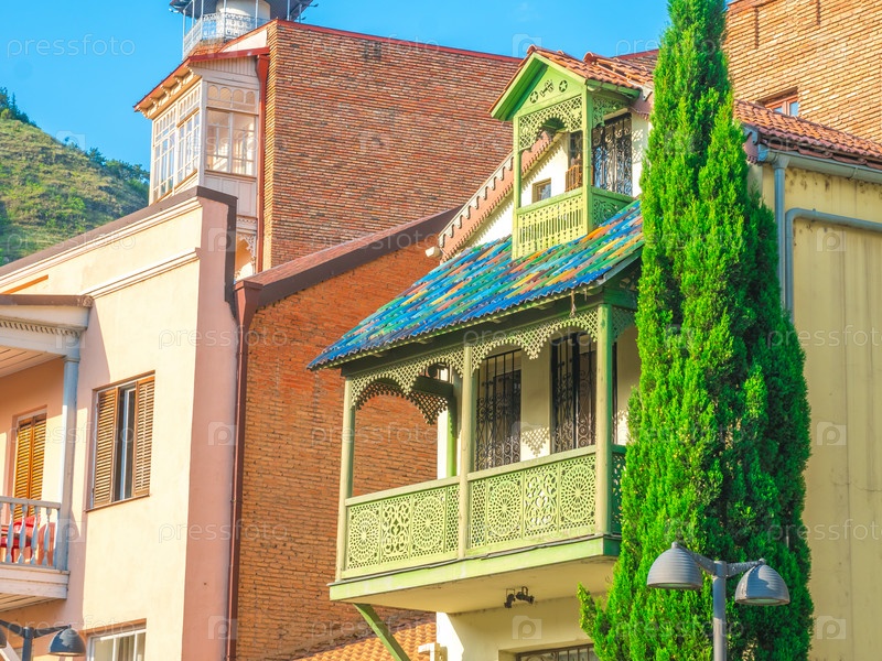Красочные традиционные дома с деревянными резными балконами в районе Абанотубани старого города Тбилиси, Грузия