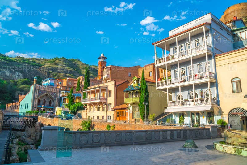 Красочные традиционные дома с деревянными резными балконами в районе Абанотубани старого города Тбилиси, Грузия
