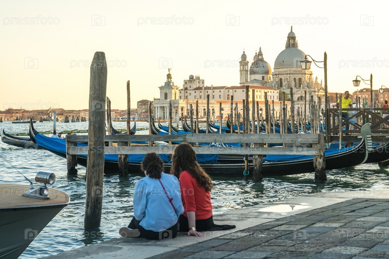 Пара туристов сидит у канала с гондолами в Венеции, Италия