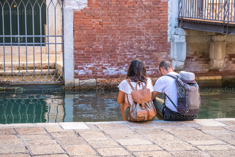 Пара туристов сидит у канала в Венеции, Италия
