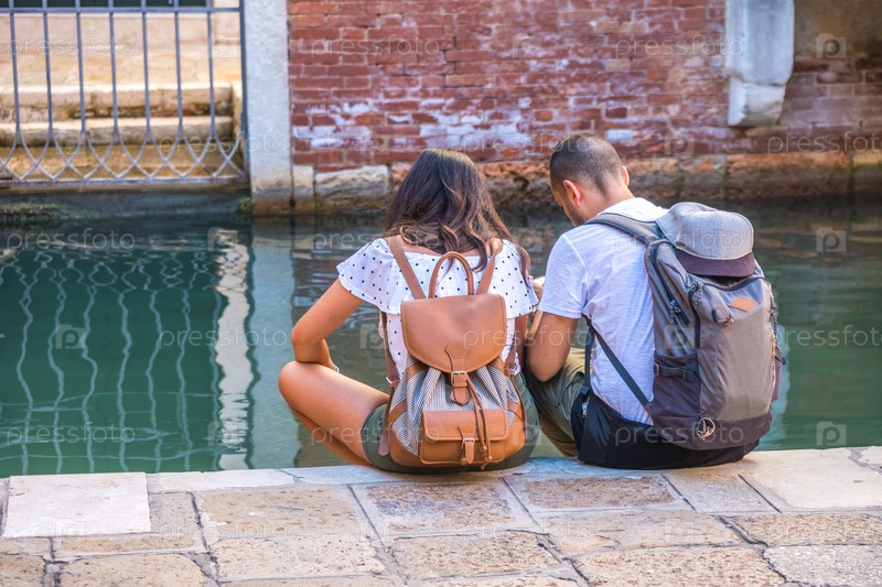 Пара туристов сидит у канала в Венеции, Италия