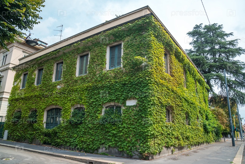 Вид на фасад дома со стеной и окнами, покрытый переросшим растением