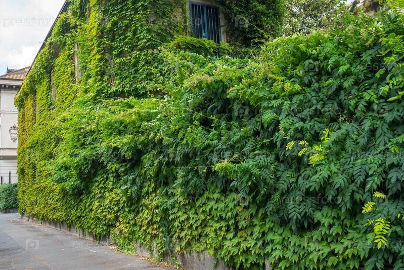 Вид на фасад дома со стеной и окнами, покрытый переросшим растением