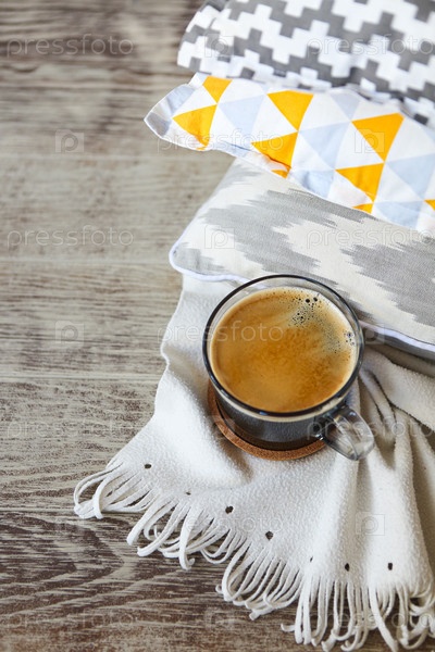 Желто-серые подушки и чашка кофе на фоне стены