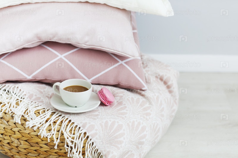 Розово-белые подушки и чашка кофе на фоне стены