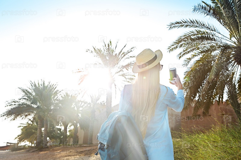 Туристка в шляпе фотографирует старую часть Дубая с помощью мобильного смартфона