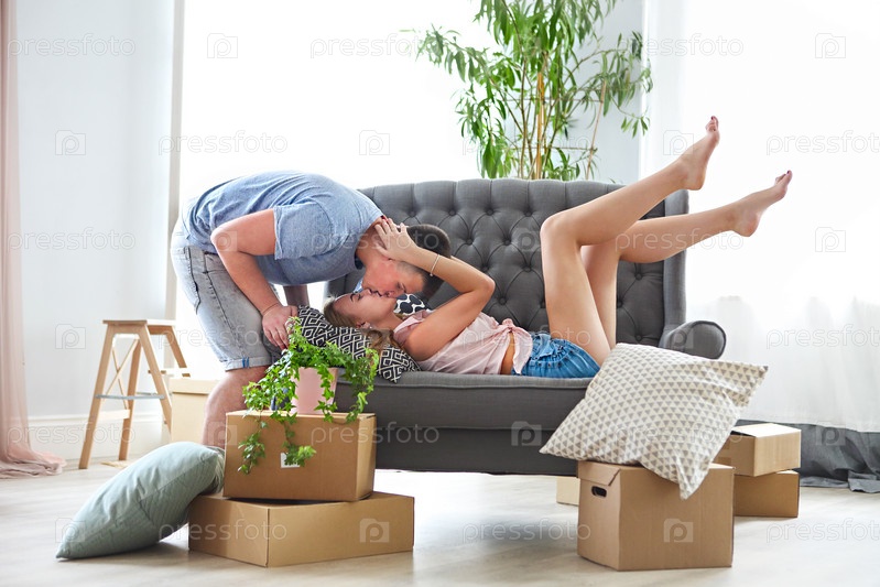 Молодая счастливая пара в комнате с коробками для переездов