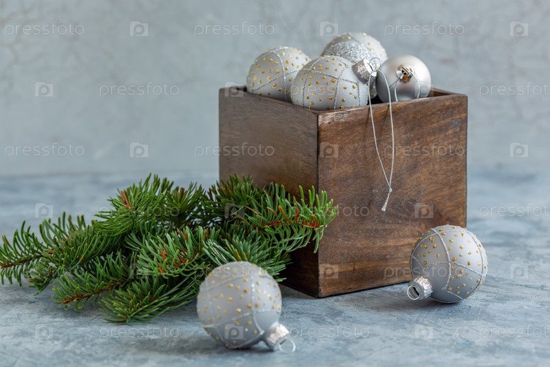 Рождественские серебряные шары в старой деревянной коробке