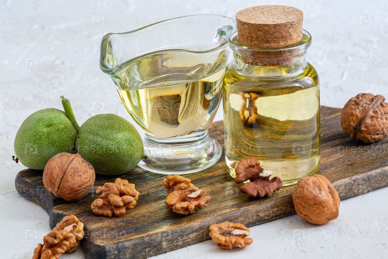 Ореховое масло в бутылке и стеклянной чашке