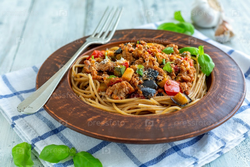 Спагетти с болонским соусом, кабачками и баклажанами