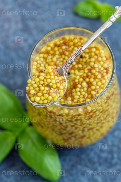 Ложка с горчичным соусом в ближайшем плане