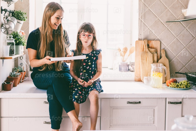 Мама с ребенком ест на кухонном столе