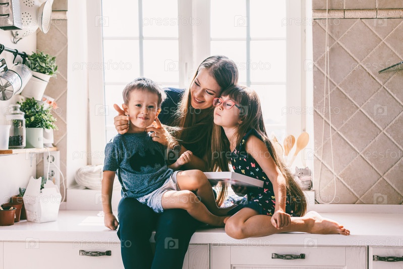 Мама с детьми ест на кухонном столе