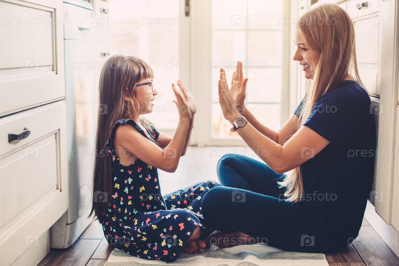 Мама играет с дочерью на кухонном полу