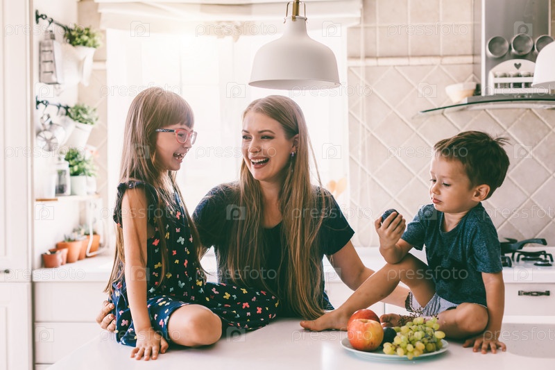 Мама с детьми ест на кухонном столе
