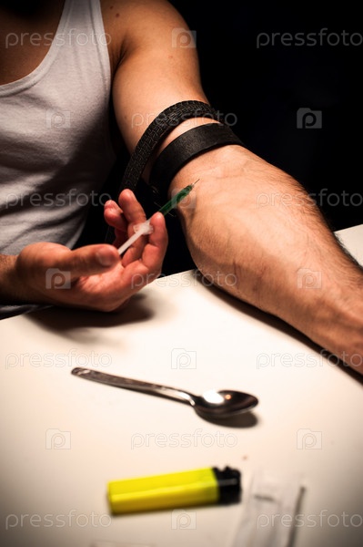 Наркозависимый молодой человек с шприцем в действии