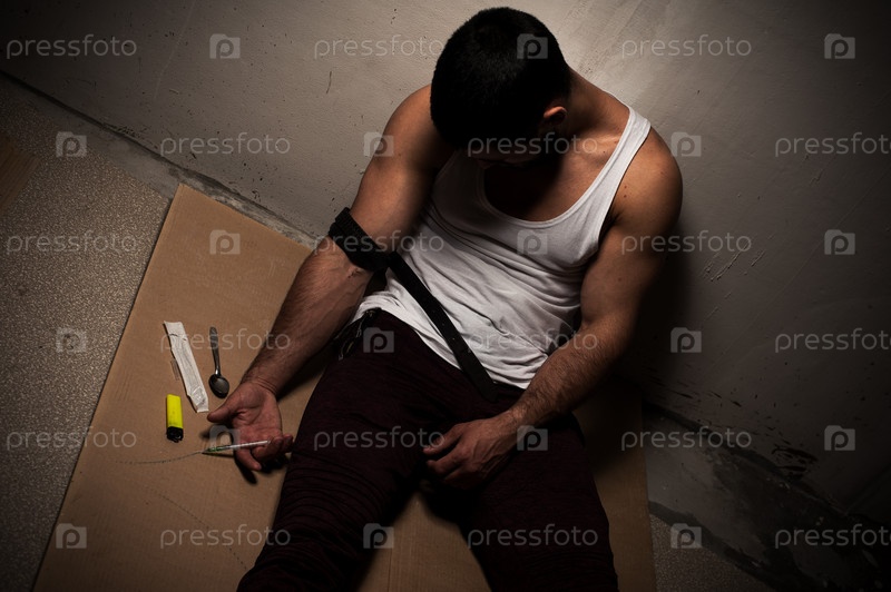 Передозировка молодого взрослого мужчины, сидящего с шприцем