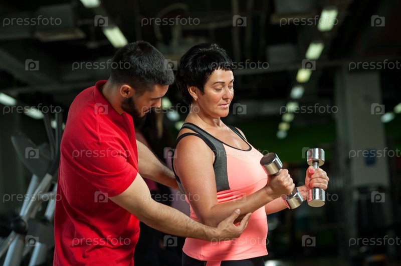 Личный тренер с женщиной средних лет в тренажерном зале