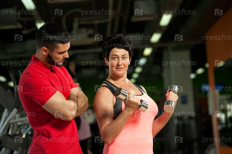Брюнетка делает силовые упражнения с тренером
