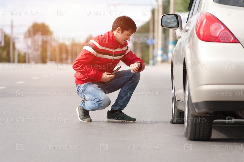 Мужчина-водитель проверяет колесо после поломки автомобиля