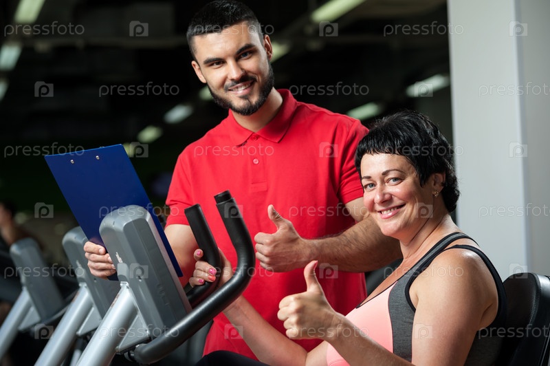 Улыбающийся личный тренер с клиентом-женщиной в спортзале