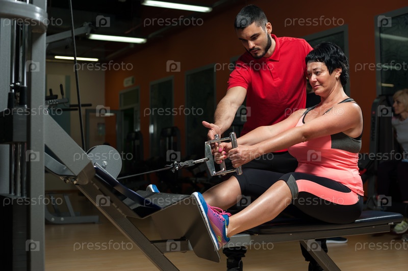 Молодой мужской тренер помогает женщине-клиенту в спортзале