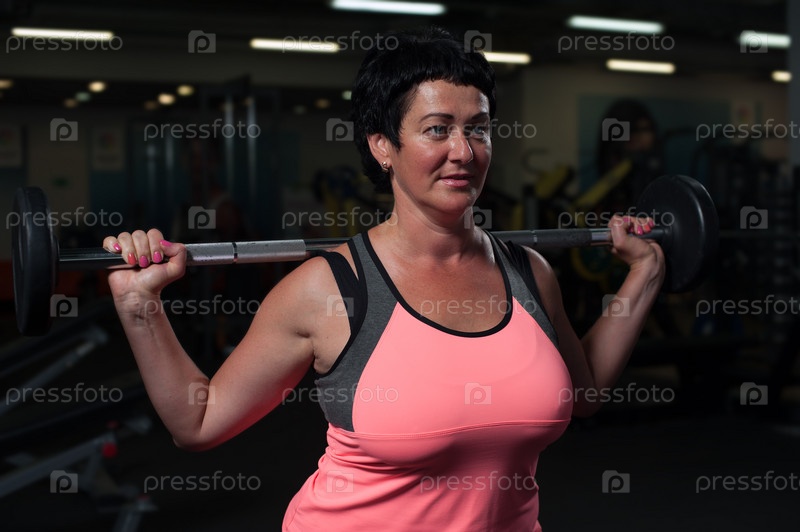 Женщина средних лет, занимающаяся с помощью штанги в спортзале