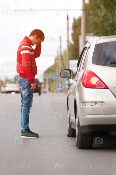 Молодой человек, имеющий проблемы с автомобилем на городской дороге