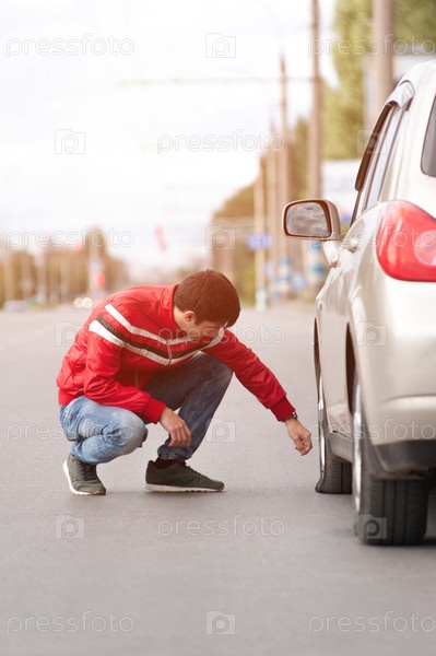 Молодой водитель проверяет колесо после поломки автомобиля