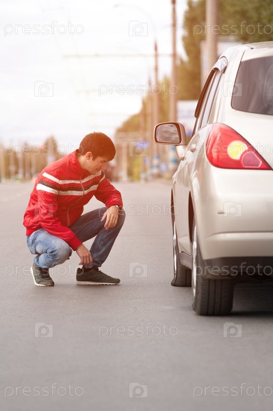 Молодой человек проверяет колесо на городской дороге