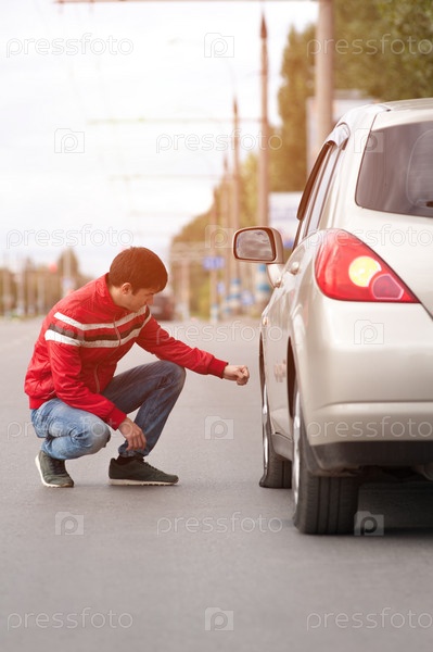 Молодой человек проверяет колесо на городской дороге