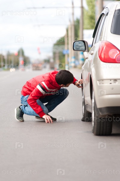 Водитель мужского пола, имеющий проблемы с автомобилем на городской дороге