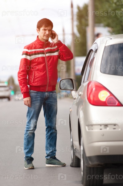 Водитель мужского пола, вызывающий помощь автомобилю на городской дороге