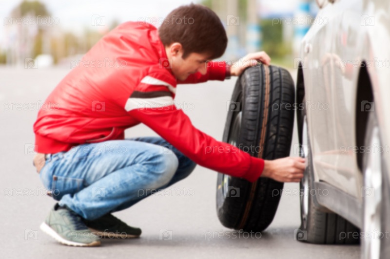 Мужчина-водитель меняет колесо после поломки автомобиля