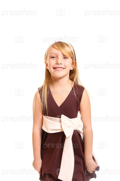 Портрет смеющейся девочки в платье на белом фоне