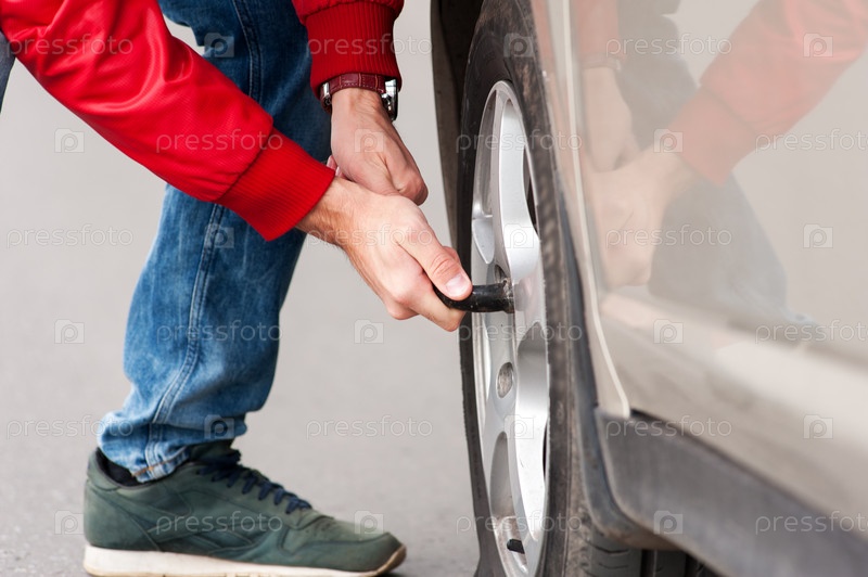 Водитель мужского пола, меняющий запасное колесо на городской дороге