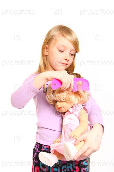 Девочка расчесывает волосы кукле на белом фоне